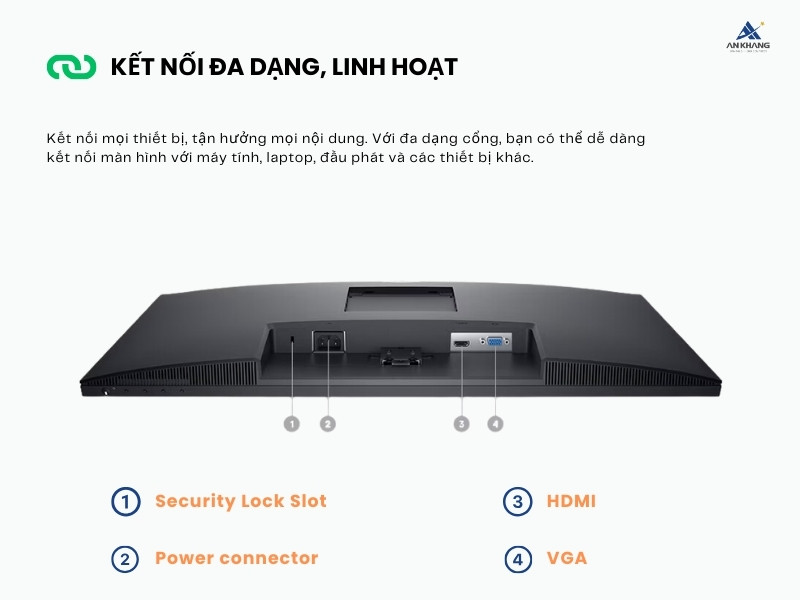 Với 2 cổng chính gồm HDMI (HDCP 1.4) và VGA, màn hình này không chỉ tương thích với hầu hết các thiết bị máy tính hiện đại mà còn hỗ trợ kết nối với các thiết bị đời cũ. Cổng HDMI cho phép truyền tải tín hiệu hình ảnh và âm thanh chất lượng cao, giúp người dùng tận hưởng trải nghiệm giải trí sống động, sắc nét. Đồng thời, cổng hỗ trợ chuẩn HDCP 1.4 đảm bảo màn hình có thể hiển thị nội dung được bảo vệ bản quyền một cách an toàn, từ đó phù hợp với các ứng dụng đa phương tiện cao cấp.